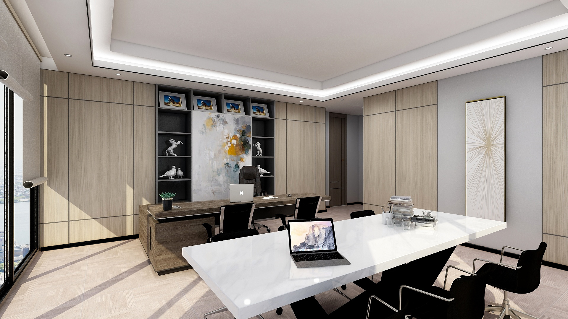 淺色系如白色、米色、淡灰色等常常被用于小空間的寫字樓,以增加空間的明亮度和開闊感。這些色彩能夠反射更多的光線,使空間看起來更加寬敞、整潔,減少壓抑感。